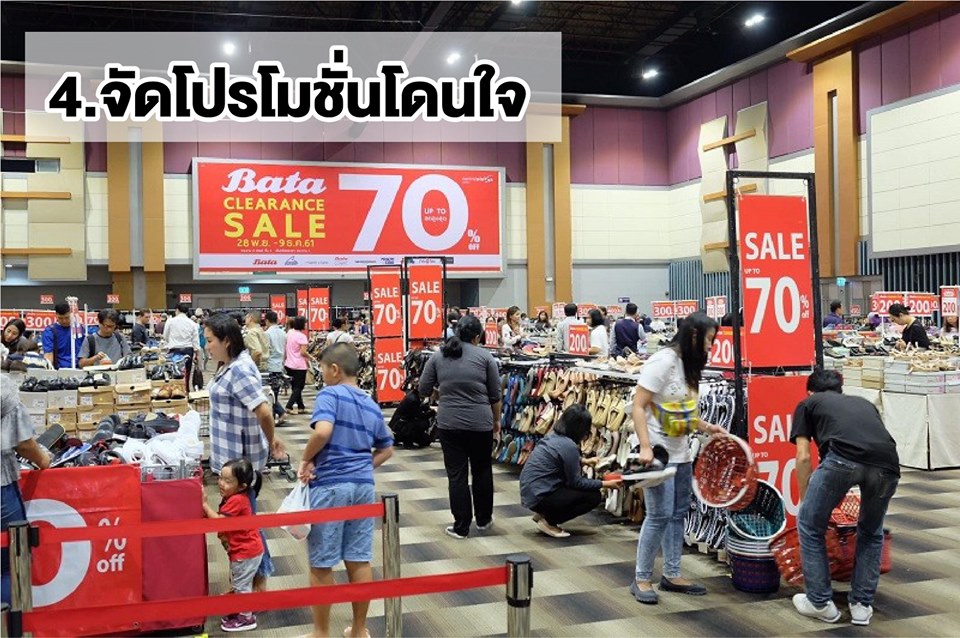 ขึ้นป้าย SALE ตัวใหญ่ๆ ตามด้วยการลดราคาด้วยตัวเลขที่ปลุกเร้าอารมณ์เพื่อชักจูงลูกค้า ให้เดินช้าๆ มาดูที่บูธเรา เช่น ลดราคา50-70% ซื้อ1แถม1 ชิ้นต่อไปราคา 1 บาท